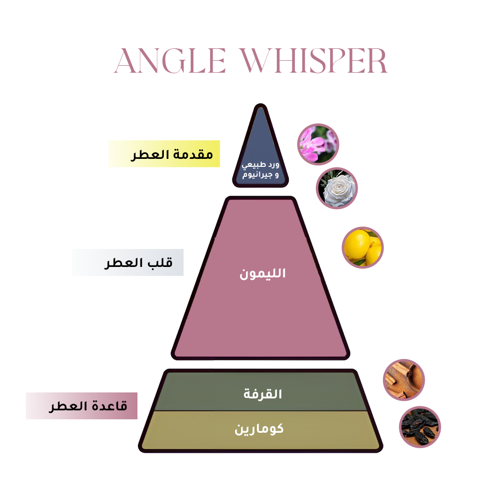 عطر زهري Angel Whisper سحر الهدوء والأنوثة الراقية فى زجاجه واحده، العطر الذي يهمس بجمالك في كل لحظة. تنساب نغماته بنعومة تحملك إلى عالم من الأناقة الحالمة، تبدأ بنفحات ناعمة ومشرقة تعكس صفاء الروح، ثم تتطور إلى قلبٍ دافئ ينبض بالرقة والسكينة، ليستقر في النهاية على قاعدة فاخرة تمنحك ثباتًا ودفئًا يدومان طويلاً.