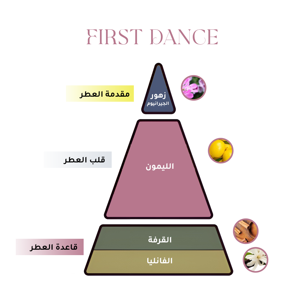 عطر وردي نسائي FIRST DANCE تحفة أنثوية تجمع بين الرقة والفخامة في تناغم ساحر. رحلته تبدأ بنفحات ناعمة بمكونات هادئة تعبّر عن الأنوثة والصفاء، ثم نتسلل نحو قلب دافئ مليء بالرقي والجاذبية يشبة قلب المرأة العصرية، لتستقر على قاعدة فاخرة تمنحك حضورًا لا يُنسى وإطلالة تفوح أناقةً وثقة في كل لحظة.